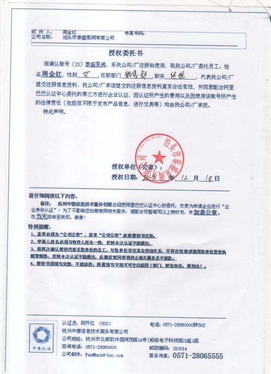 泰盛泵閥公司為了更進一步打造出自己的“齒輪泵行業(yè)_泰盛”品牌。在2014年12月19日通過了阿里巴巴第三方的企業(yè)身份認證,認證中心對我公司提交的的所有泰盛泵閥資料信息合法有效。這是泰盛公司加蓋公章并簽字的認證書合同。